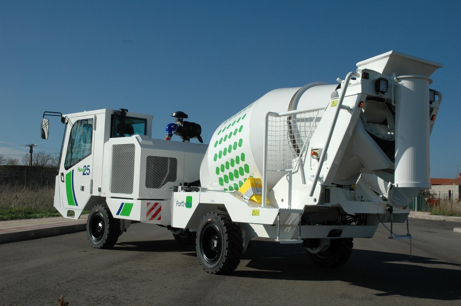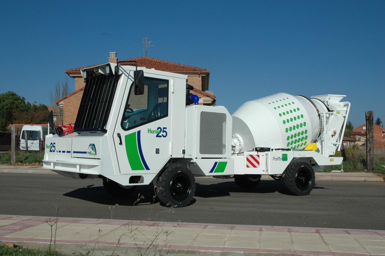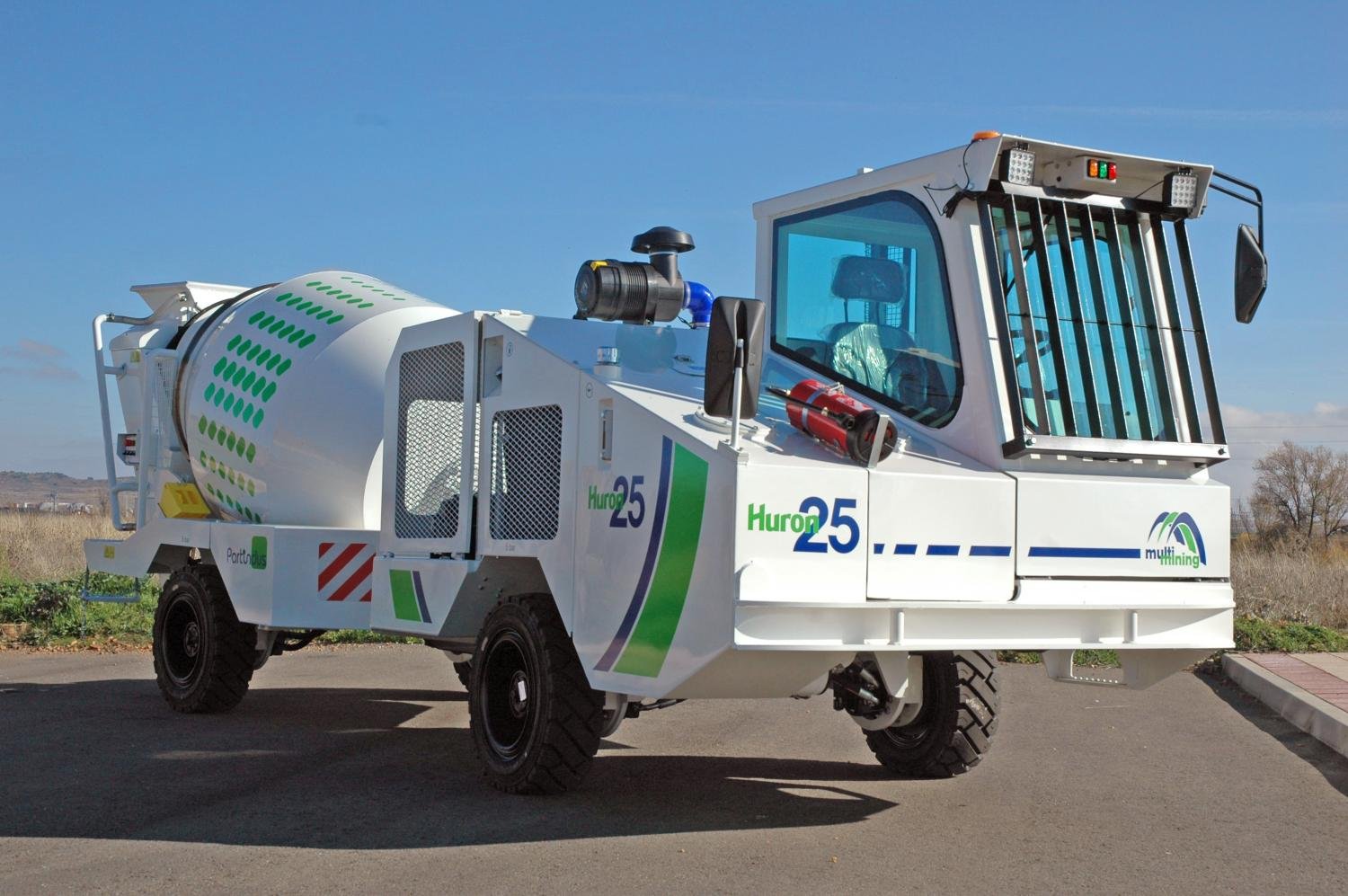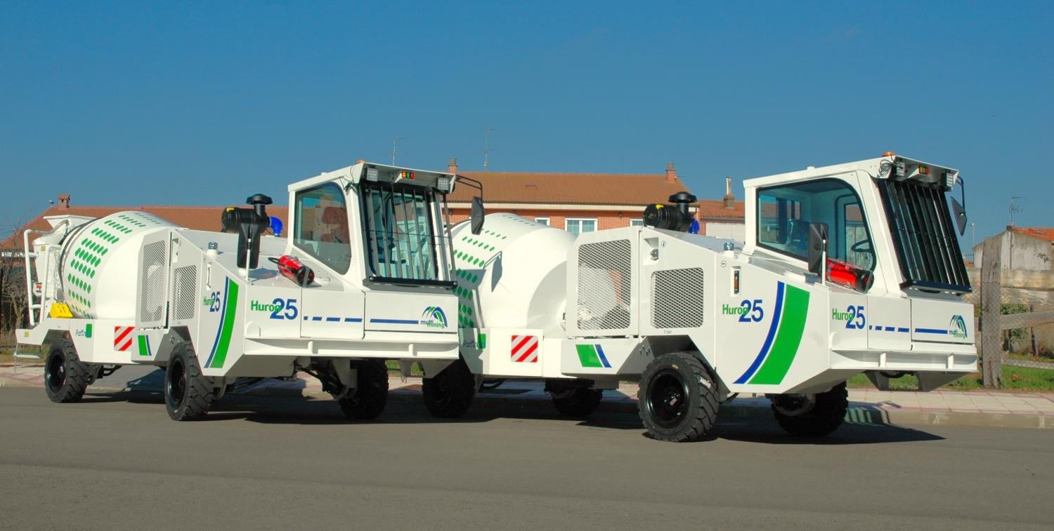 Equipo hormigonera de 2,5 m3, de reducidas dimensiones para transportar y mezclar hormigón, en seco o en húmedo, en túneles y galerías de muy bajo perfil, donde otros equipos son incapaces de llegar.